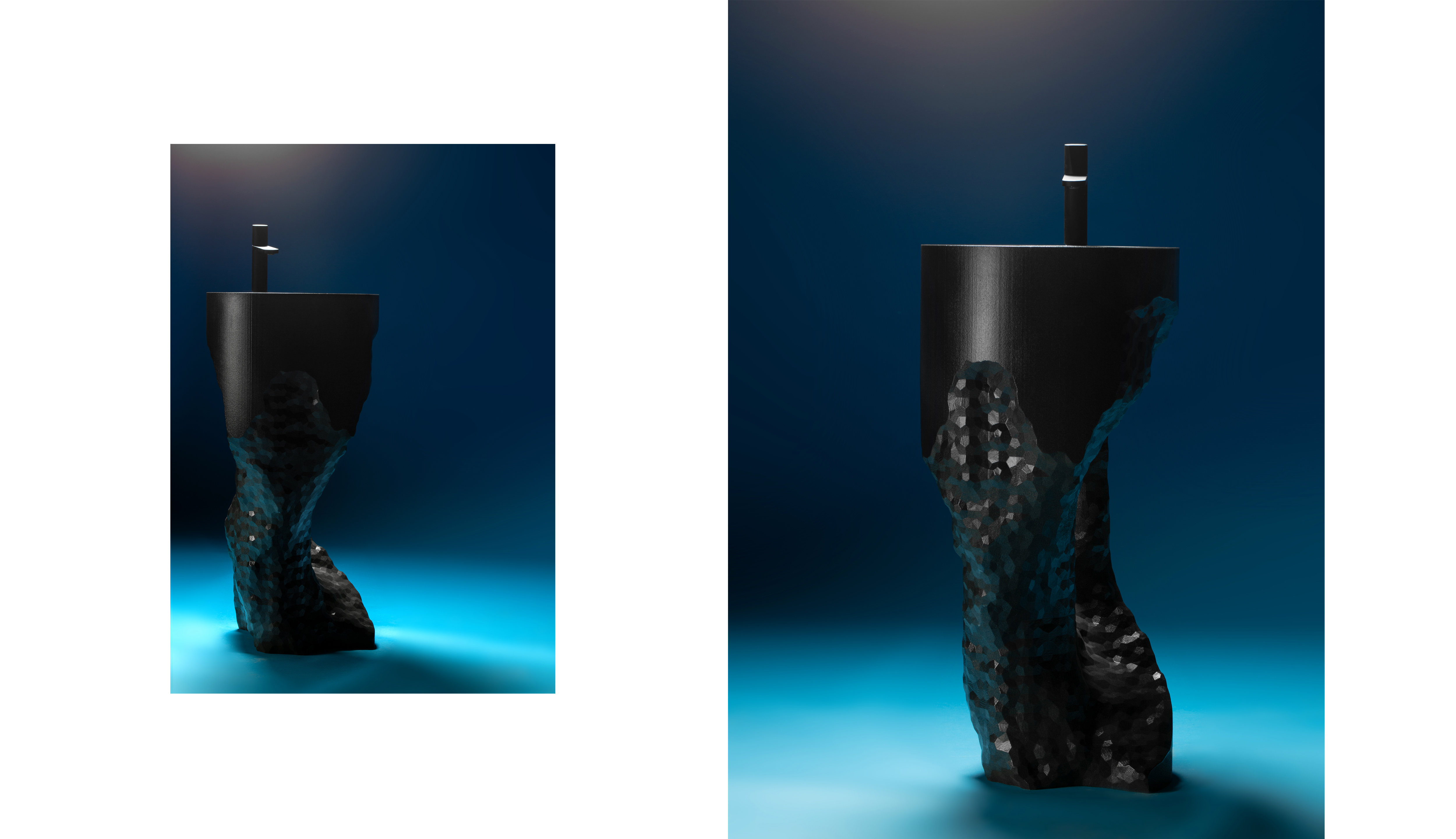 The collection draws inspiration from the natural world, such as crystals and stone formations molded by wind and water. It intentionally diverges from a minimalistic formal language and instead embraces a more expressive aesthetic that brings us closer to our inner selves. The collection's design is intentionally sculptural, yet its functional details are expressed in a raw and straightforward manner. The objects invite the user to engage with them over time, to explore their form in different lighting conditions and from various perspectives.